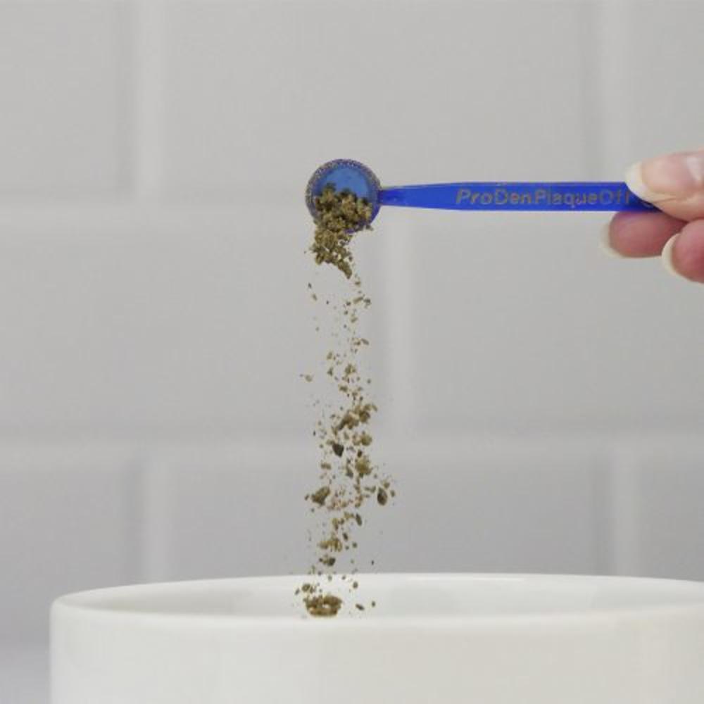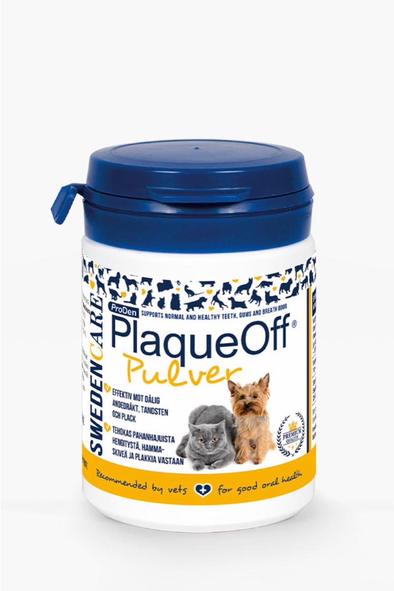 ProDen PlaqueOff® Pulver är ett 100% naturligt kosttillskott för hundar som innehåller den 100% naturliga och ekologiska algen A.N ProDen® – bevisad i kliniska studier att minska plack och tandsten och förbättra dålig andedräkt. Resultaten ses vanligtvis mellan 3 och 8 veckor vid regelbunden användning. A.N ProDen® skördas hållbart längs Nord Atlanten och den 100% naturliga ingrediensen är fri från tillsatser och konstgjorda konserveringsmedel och innehåller inget gluten eller tillsatt socker. ProDen PlaqueOff® Pulver verkar genom husdjurets kropp där den mjukar upp befintlig tandsten och förhindrar att ny plack bildas. Strö pulvret över hundens mat en gång om dagen med den medföljande skopan. För en hund på 10 kg håller en 60 g burk ungefär 5 månader.