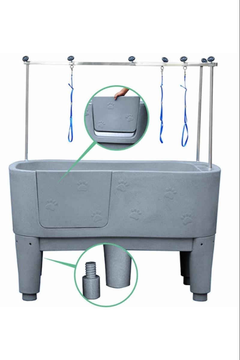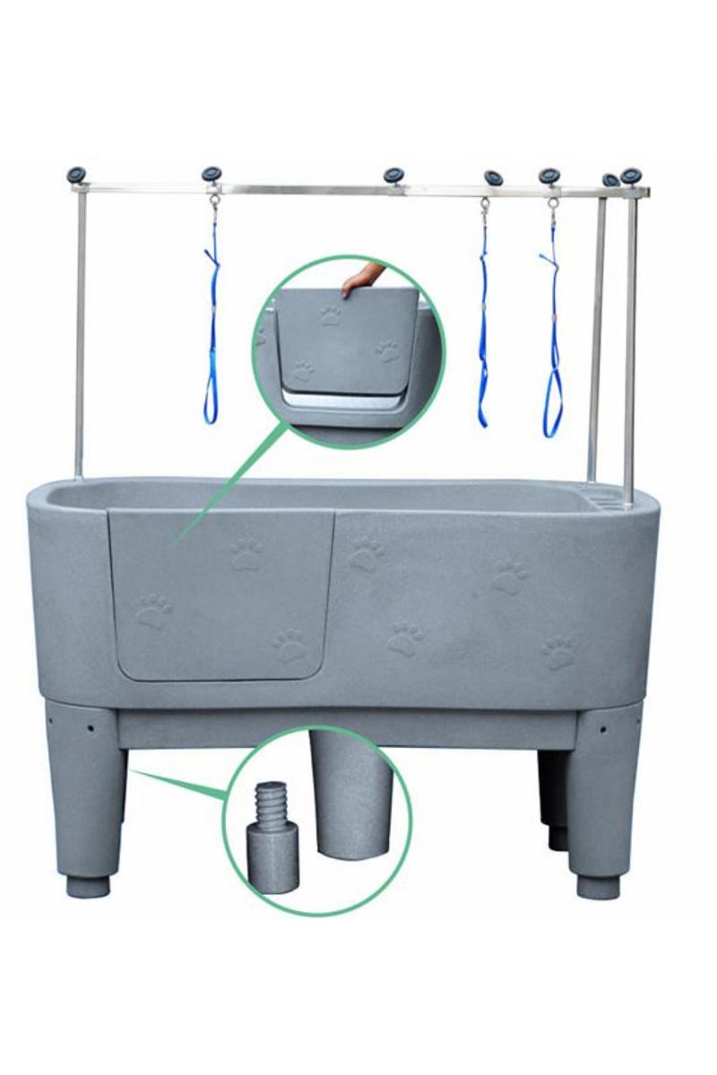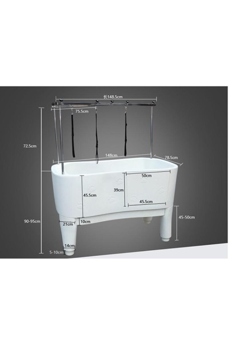 Ett rejält och stabilt badkar i plast. Karet har en lucka på långsidan för att underlätta i och urgång. Upp till luckans nederkant är det 50cm. Karets totala djup är 51cm. Det medföljer en nivåskiva att användas till småhundar och då blir djupet endast 20cm. Karet levereras komplett med ram/galge , avloppsslang och avloppssil.