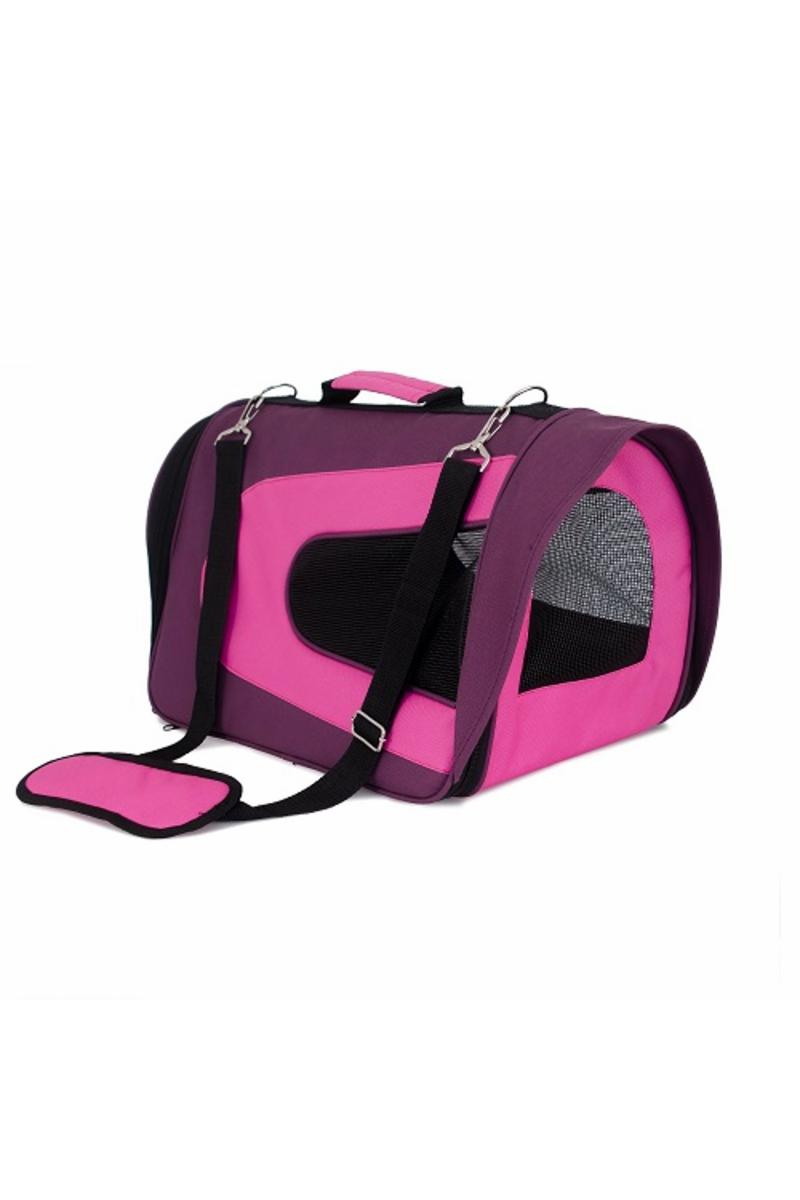 Praktisk, hopfällbar och slitstark bärväska i canvas. Maxvikt hund 7 kg. Rosa/Lila/Svart. 46x26x27cm