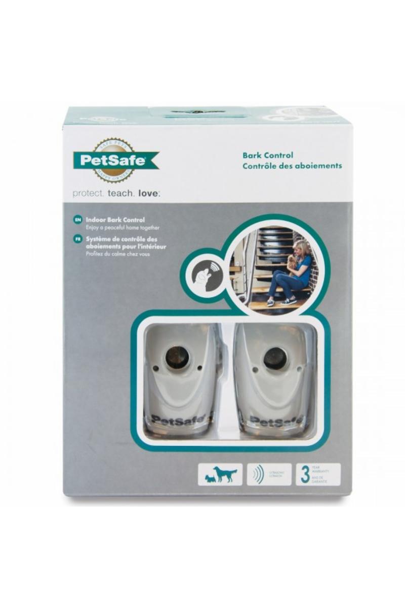 Skallbegränsare inomhus. Inga halsband behövs. Upptäcker skall på 8 meters håll. Indikerar låg-batterinivå. Fristående, kan sättas vi dörrar eller i fönsterkarmar. Två enheter för större täckningsområde. Batterier medföljer.