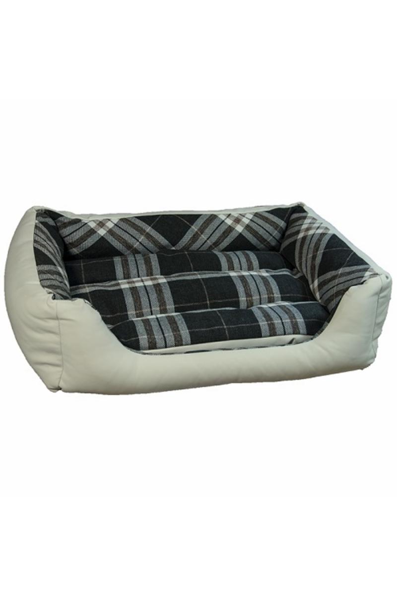 Rutig insida i grått/vitt/brunt canvastyg. Går att tvättas i 40 grader. Vändbar dyna.