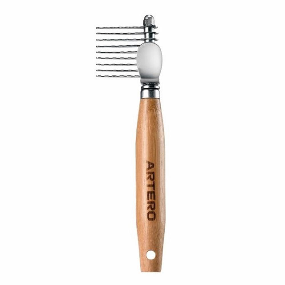 Artero tovdelare med korta blad, ett effektivt och säkert pälsverktyg för eliminering av tovor. Har din hund tovor som inte är möjliga att reda ut med kam, borste eller karda är detta ett perfekt verktyg att använda. Nätt och smidig modell med korta blad som gör det lättare att komma åt även på svåråtkomliga områden. De vågiga bladen är mycket vassa och delar enkelt även kraftiga tovor. Säker att använda tack vare bladens rundade toppar och fingerstödet för tummen. Bekvämt och greppvänligt handtag i bambu.