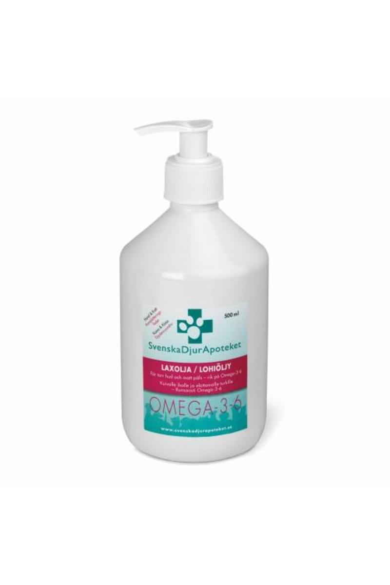 Svenska Djurapotekets Laxolja med sitt nyttiga innehåll av Omega-3-6. bidrar till djurets hjärt-och kärlhälsa samt ledernas funktion. Pälsen blir glansigare och tjockare. Omega-3 är en nödvändig fettsyra för cellernas funktion och har en positiv inverkan på koncentrationsförmågan och nervsystemet. Laxoljan från Svenska DjurApoteket kommer från färsk norsk kvalitetslax och är en naturlig produkt. Med de berikande långkedjade Omega 3 fettsyrorna med sina höga halter av de livsnödvändiga fettsyrorna EPA och DHA, kända för att ha välgörande effekter på hund och katt. Ditt husdjur tillgodogör sig mycket lättare Omega 3 fettsyrorna EPA och DHA än Omega 3 från växtriket. Kliar sig hunden eller katten kan det vara tecken på torr hud och då kan laxolja hjälpa mot kliandet. Till alla djur som önskar en bättre päls, eller om man har problem med trasiga klor så kan ett tillskott av laxolja förbättra kvaliteten. Ingredienser: Kallpressad Laxolja från Norge. Deklaration per pumptryck á 1,25ml •Energi 410 kcal/42 kJ •Varav mättade fettsyror 241mg •Varav enkelomättade fettsyror 483 mg •Varav fleromättade fettsyror 402 mg •Varav Omega-3 322 mg •Varav DHA 100 mg •Varav EPA 95 mg Dosering: •Katt/liten hund upptill 10 kg: 2 pump •Hund 10-25 kg: 4 pump •Hund 25–40kg 6 pump •Hund 40 kg+ 8 pump Blandas i maten en gång per dag. Oöppnad flaska kan förvaras i rumstemperatur och oåtkomligt för barn. Öppnad flaska håller i 3 månader och ska förvaras i kylskåp.