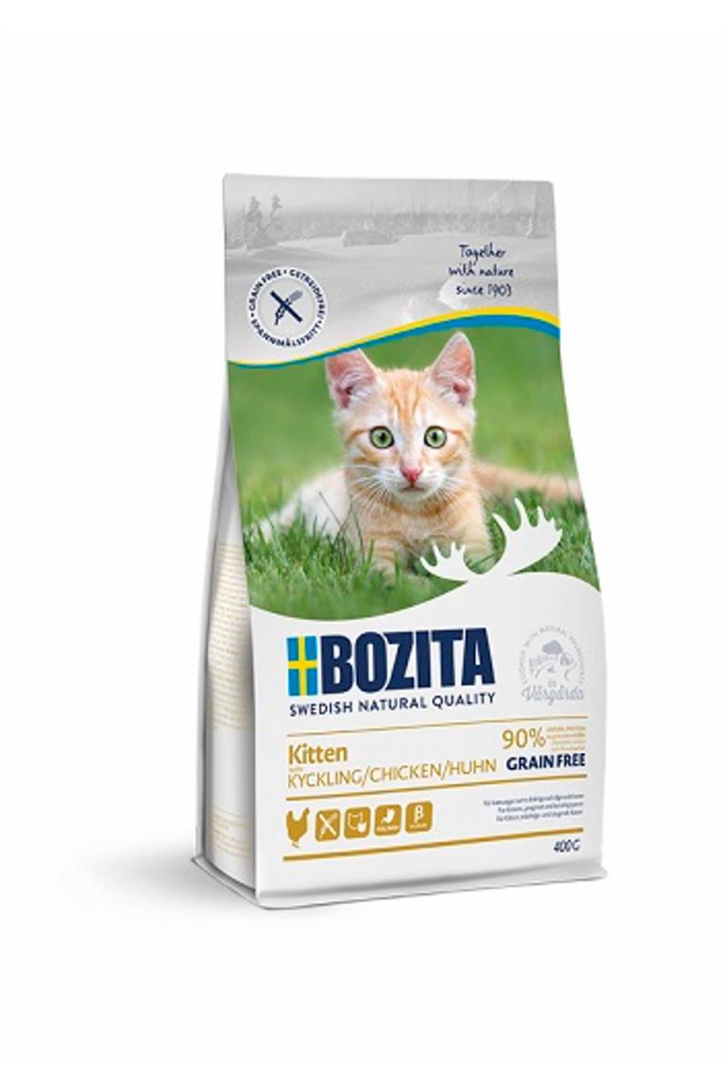 Helfoder för kattungar och dräktiga och digivande katter. Tillverkad utan spannmål. Serveras torrt tillsammans med en skål friskt vatten. 20% fett, 34% protein Spannmålsfritt Kyckling Spannmålsfritt För kattungar samt dräktiga och digivande katter. Lax bidrar med nyttiga fettsyror som gynnar kattungens utveckling av tex. hjärna och syn. FOS och MOS är prebiotiska fiber som främjar en god och funktionell tarmflora. Naturliga betaglukaner från jäst med hälsofrämjande egenskaper Bozita Kitten Spannmålsfri Kyckling är ett helfoder för kattungar och unga katter med små anpassade bitar. Fodret uppfyller den unga kattens höga energi- och proteinbehov, vilket ger optimala förutsättningar för tillväxt och muskeluppbyggnad. Det relativt höga energiinnehållet är också utmärkt för dräktiga och digivande katter. Kyckling och lax ger hög smaklighet och hög smältbarhet, vilket gör att kattungen kan tillgodogöra sig näringsämnena bättre. Lax bidrar med nyttiga fettsyror som gynnar kattungens utveckling av tex. hjärna och syn. En bra fungerande mage är viktigt för den känsliga kattungen därför innehåller fodret naturlig prebiotika i form av FOS och MOS som bidrar till en bra mag och tarmfunktion. Fodret innehåller även naturliga hälsofrämjande betaglukaner från jäst och har en optimal mineralbalans (Ca, P, Mg) och innehåller höga andelar av vitaminer och taurin