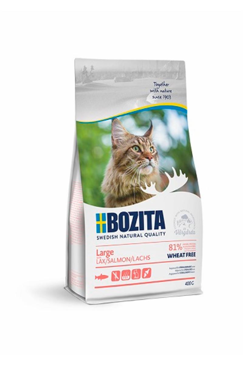 Helfoder för vuxna katter. Tillverkad utan vete. Serveras torrt tillsammans med en skål friskt vatten. 18% fett, 31% protein Vetefritt Fisk Vetefritt Lax bidrar med nyttiga fettsyror som tillsammans med biotin och zink ger goda förutsättningar för frisk hud och fin päls. Cellulosafibrer minskar risken för hårbollar. Glukosamin och kondroitinsulfat är naturliga delar av hälsosamma leder. Naturliga betaglukaner från jäst med hälsofrämjande egenskaper Balanserat mineralinnehåll anpassat för den steriliserade katten. FOS och MOS är prebiotiska fiber som främjar en god och funktionell tarmflora. Bozita Large Vetefri Lax är ett helfoder för vuxna katter. Innehåll och bitstorlek lämpar sig särskilt väl för katter av större modell, katter som äter för snabbt samt för långhåriga katter. Färsklagad lax bidrar till att höja smakligheten och smältbarheten hos fodret, så att katten lättare kan tillgodogöra sig näringsämnena. Lax bidrar med nyttiga fettsyror som tillsammans med biotin och zink ger goda förutsättningar för frisk hud och fin päls. För den långhåriga katten har vi tillsatt olösliga fibrer som minskar risken för hårbollar. Fodret innehåller naturliga hälsofrämjande betaglukaner från jäst och kondroitinsulfat och glukosamin, naturliga delar av hälsosamma leder som passar den större katten. Fodret har även en optimal mineralbalans (Ca, P, Mg) och innehåller höga andelar av vitaminer och taurin.