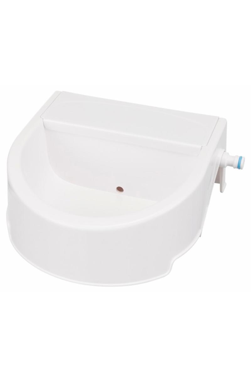 Fäst en slang (Ø 13 mm) med snabbkoppling (1/2") på höger sida av skålen. Kan även fästas på väggen (monteringsmaterial ingår ej för väggmontering). Inbyggd sensor kontrollerar vattennivån och fyller automatiskt på vatten eftersom (likt en toaletttank). Helt mekanisk och drivs utan el och batterier. Enkel att rengöra.
