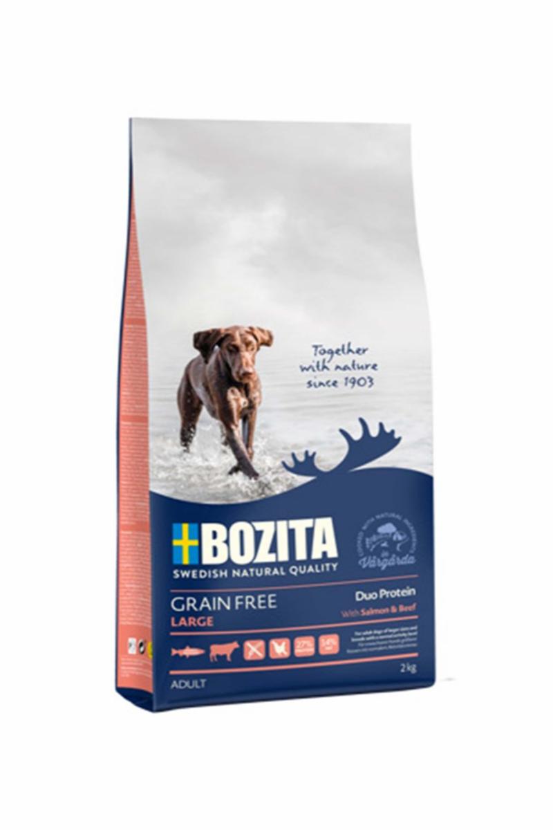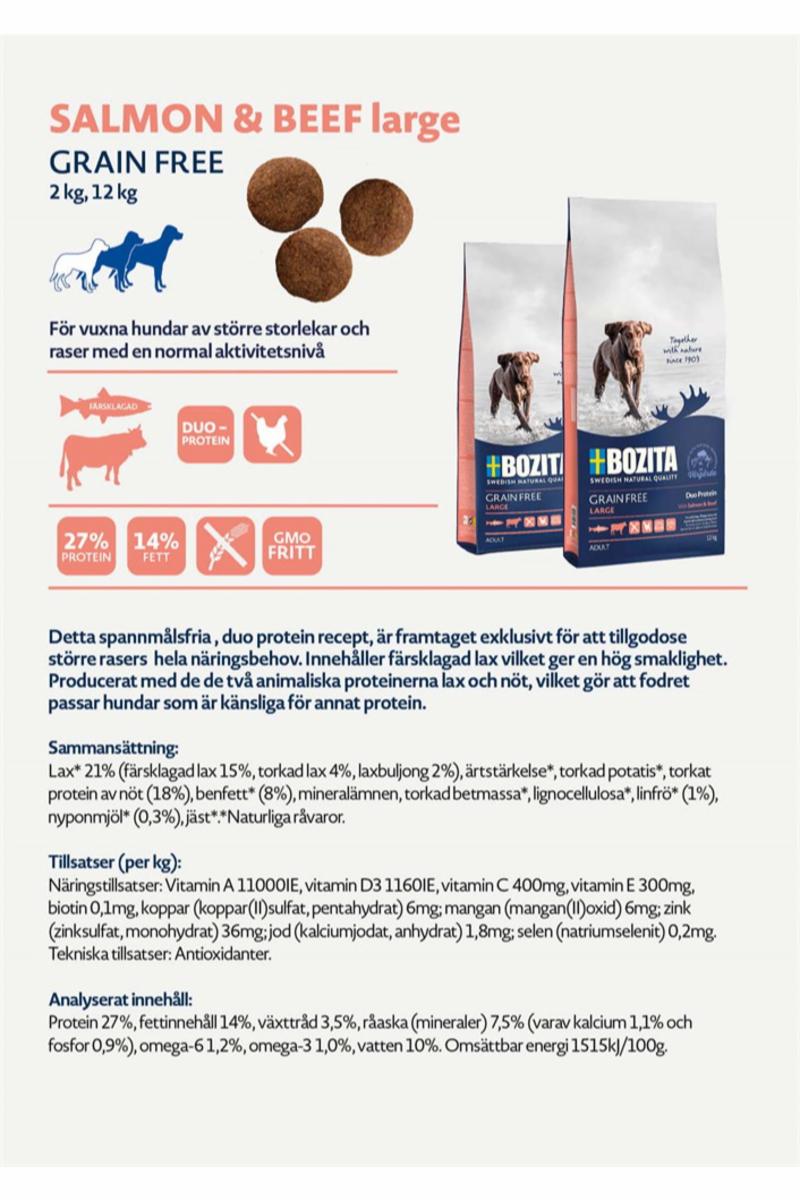 Detta spannmålsfria , duo protein recept, är framtaget exklusivt för att tillgodose större rasers hela näringsbehov. Innehåller färsklagad lax vilket ger en hög smaklighet. Producerat med de de två animaliska proteinerna lax och nöt, vilket gör att fodret passar hundar som är känsliga för annat protein.