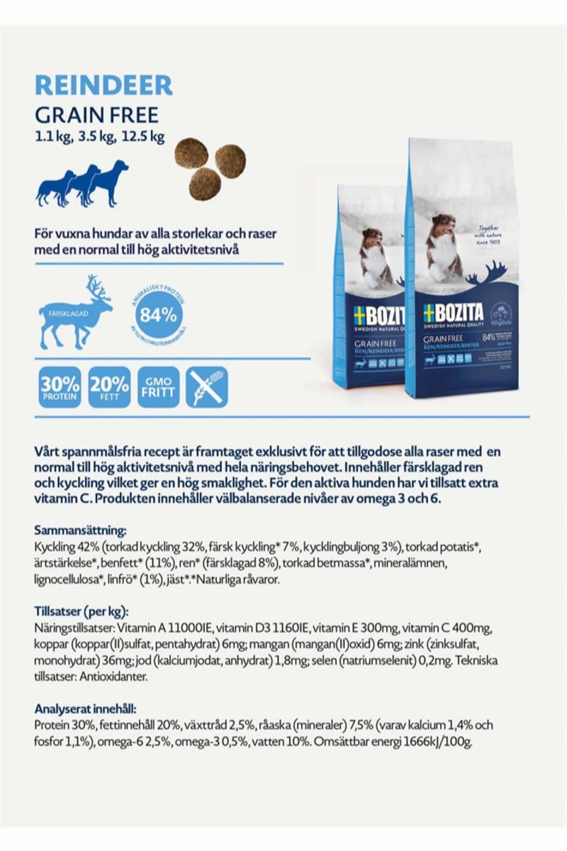 Vårt spannmålsfria recept är framtaget exklusivt för att tillgodose alla raser med en normal till hög aktivitetsnivå med hela näringsbehovet. Innehåller färsklagad ren och kyckling vilket ger en hög smaklighet. För den aktiva hunden har vi tillsatt extra vitamin C. Produkten innehåller välbalanserade nivåer av omega 3 och 6.