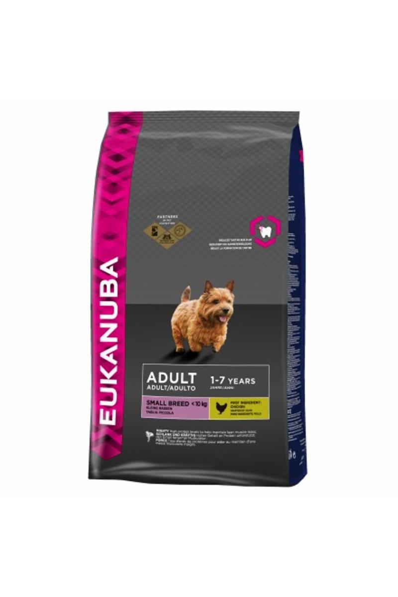 Hundar av små raser har sina egna unika näringsbehov. Eukanuba Adult Small ger optimala nivåer av protein, fett och kolhydrater till din hund för att möta dessa behov. Med mindre foderbitar anpassade för en liten hund. Det ger alla viktiga vitaminer och mineraler som behövs. Innehåller högkvalitativa råvaror och endast animaliska proteinkällor främst från kyckling. 100% komplett och balanserad näring för små vuxna hundar med en normal aktivitetsnivå och normal vikt. Tandvårdssystem Tandvårdssystem som enligt klinisk dokumentation minskar uppbyggnaden av tandsten med 80% bevisad effekt. Starkt Skelett Innehåller kalcium som sträcker skelettet Optimal Matsmältning Innehåller sockerbetsfibrer och prebiotiska fibrer (FOS) som gynnar en stabil mag-och tarmhälsa, god matsmältning och effektivt näringsupptag. Slanka Muskler Det är kliniskt bevisat att animaliska proteiner gynnar starka, slanka muskler. Starkt Immunförsvar Kliniskt dokumenterade prebiotiska fibrer understödjer ett starkt naturligt immunförsvar. 65% av din hunds immunsystem finns i hans eller hennes matsmältningssystem. Innehåll Torkad kyckling och kalkon (32 %), vete, majs, animaliskt fett, sorghum, ris, korn, sockerbetsfibrer (2.9 %), hydrolyserat animaliskt protein, heläggspulver, kaliumklorid, fiskolja, linfrö, natriumhexametafosfat, frultooligosackarider (0.29 %), kalciumkarbonat. ANALYS Protein: 28.0 %, Fett: 18.0 %, Omega-6 fettsyror: 2.84 %, Omega-3 fettsyror: 0.44 %, Råaska: 7.30 %, Växttråd: 2.20 %, Vatten: 8.00 %, Kalcium: 1.30 %, Fosfor: 1.05 % TILLSATSER Vitamin A: 45.639 IU/kg, Vitamin D3: 1.514 IU/kg, Vitamin E (a-tocopherol): 254 mg/kg, Betakaroten: 5.0 mg/kg Kcal/kg: 3.788 MJ/kg: 15.9