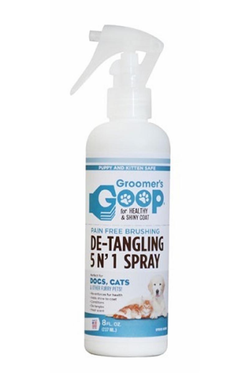 Groomer´s Goop De-Tangling 5n´1 spray - används när du borstar genom tjock eller tovig päls för att öka kambarheten och minska djurets obehag. Stärker pälsen, ger lyster, återfuktar, reder ut tovor och har en fräsh doft. Säker att använda på valp och kattunge.