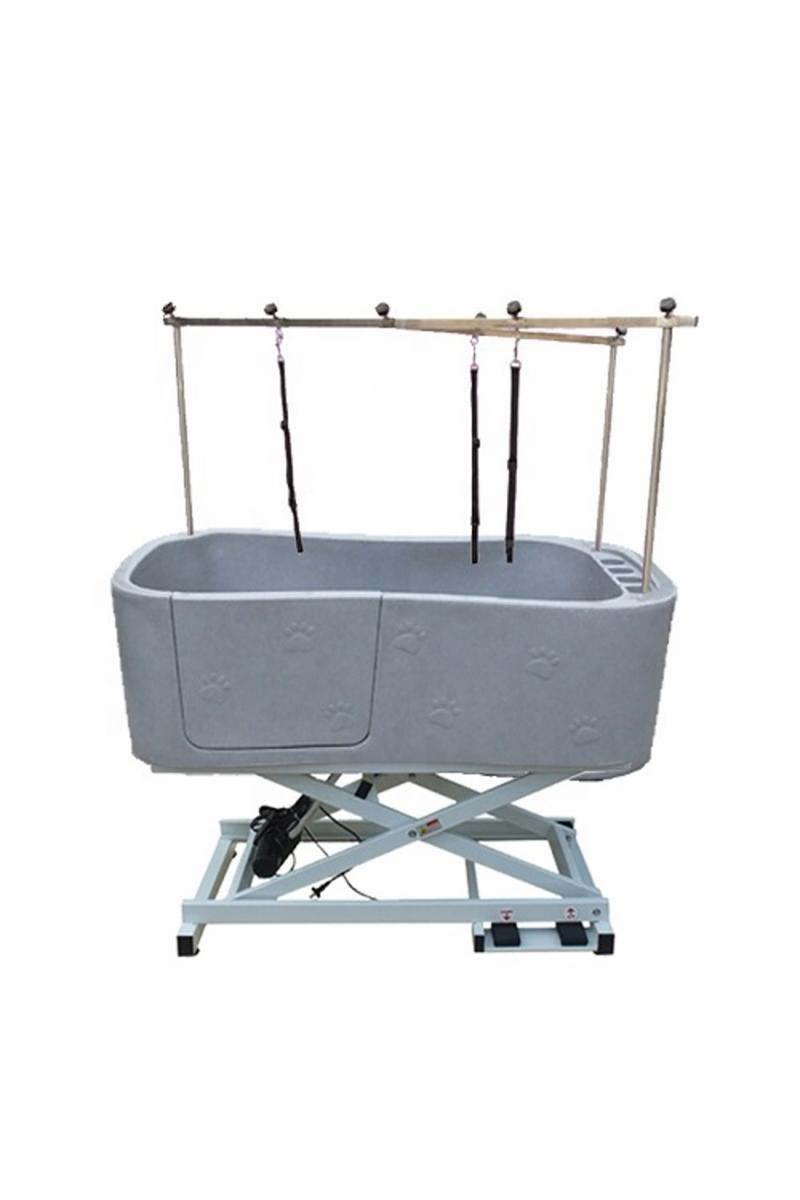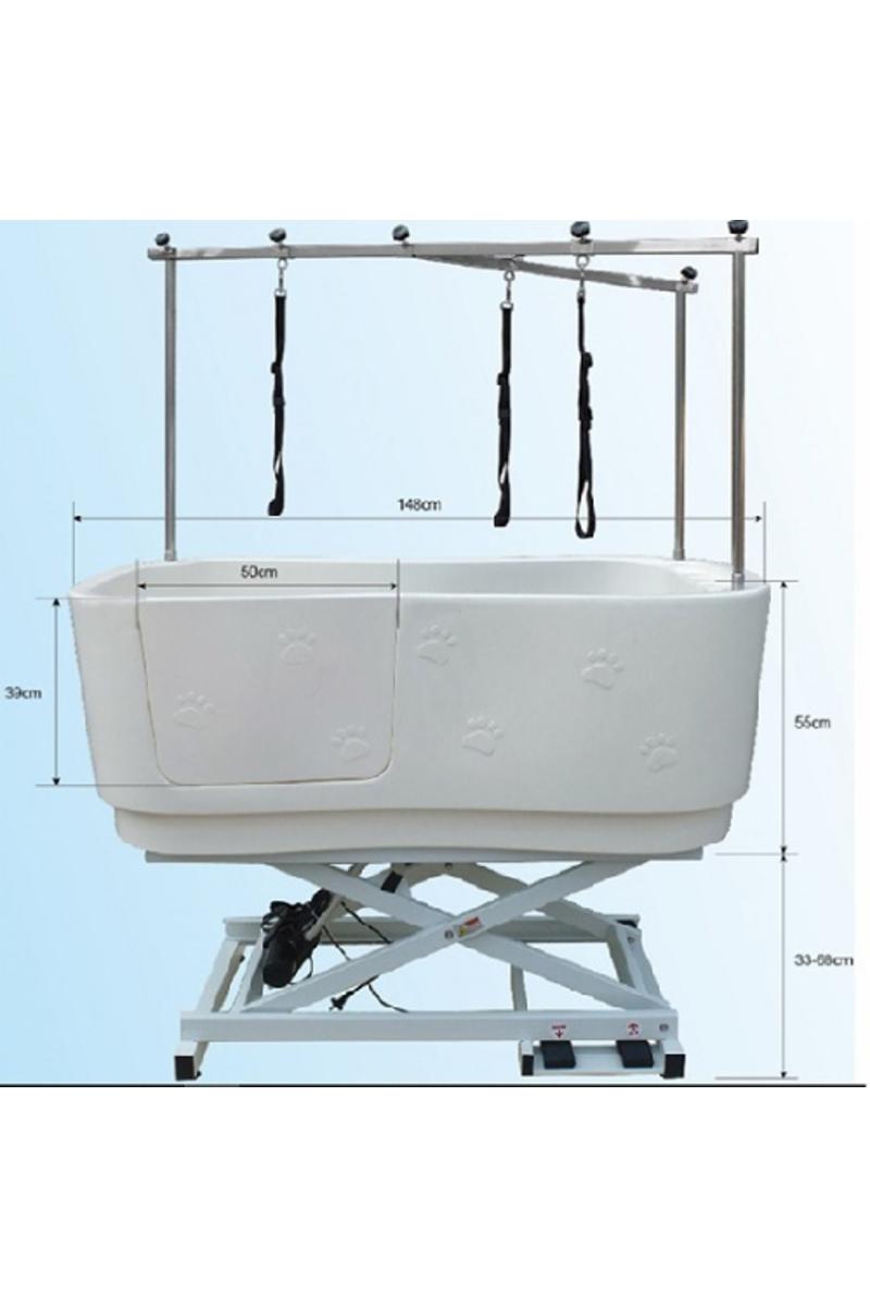Färg: Granit. Elektriskt höj o sänkbart Ett rejält och stabilt badkar i plast. Karet har en lucka på långsidan för att underlätta i och urgång. Upp till luckans nederkant är det 47cm. Karets totala djup är 50cm. Badkaret kan höjas/sänkas med 30cm, Det medföljer en nivåskiva att användas till småhundar och då blir djupet endast 20cm. Karet levereras komplett med ram/galge , avloppsslang , avloppssil, fotpedal och handkontroll.
