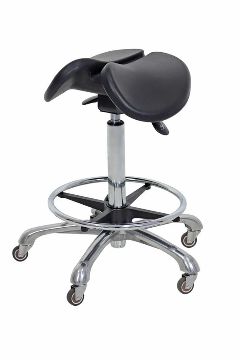 High Rise är en mycket stabil höj- och sänkbar trimstol med hög kvalitet och bästa sittkomfort. Den specialdesignade stolen i sadelmodell främjar bättre sittställning för både rygg och höfter. Den tvådelade, ergonomiska sitsen minskar trycket på bäckenbotten, vilket gör stolen till ett bra alternativ om du sitter längre stunder.