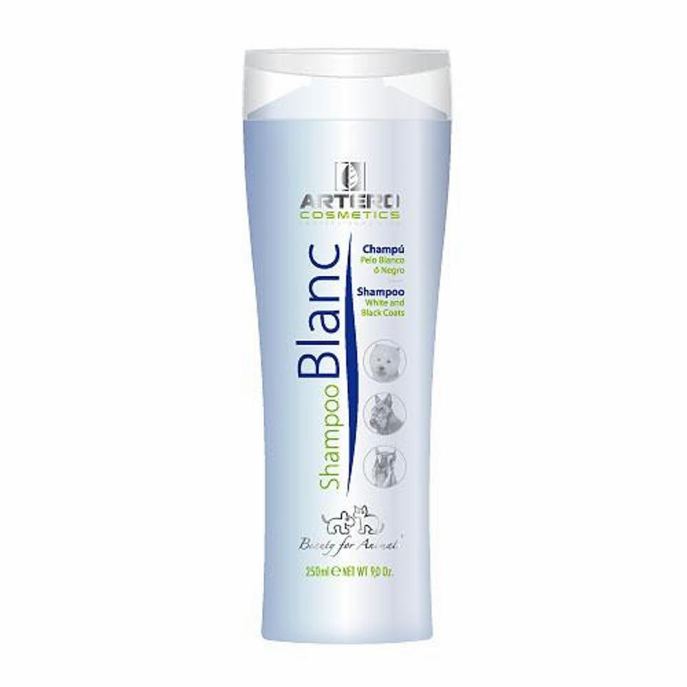 Artero Blanc är ett milt hundschampo för vita, grå och/eller svarta pälsar. Schampot eliminerar effektivt gula toner i vita pälsar samt intensifierar färgen i svarta och grå pälsar. Shampot innehåller vitamin F, hästkastanj och kamomillextrakt och har en lugnande och skyddande effekt på päls och hud. Utmärkt för hundar med känslig päls som behöver badas ofta. Lyfter fram pälsens naturliga nyans och gör den skinande ren.