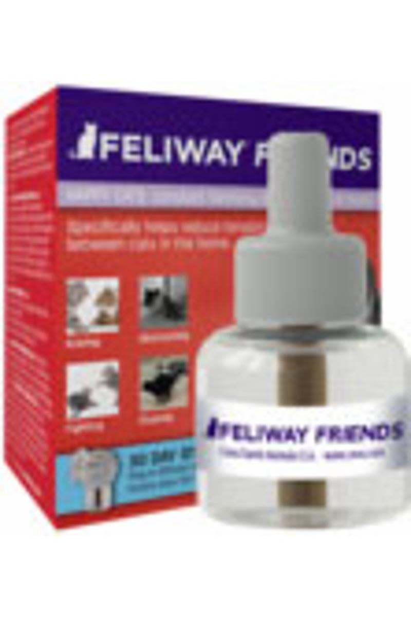 Refill till Feliway Friends doftavgivare. Feliway Friends innehåller en syntetisk kopia av kattens appeasing feromon (CAP), som honkatten utsöndrar från juverområdet när hon diar sina kattungar. Detta feromon skapar harmoniska band mellan katterna. Feliway Friends är den första produkten på marknaden med dokumenterad effekt som kan minska spänningar och konflikter mellan katter. HUR SKILJER DEN SIG FRÅN FELIWAY? De syntetiska feromonerna i Feliway Friends kommunicerar harmoni mellan katter, medan de syntetiska feromonerna i Feliway Classic (vanliga Feliway) kommunicerar trygghet i kattens hemmiljö.