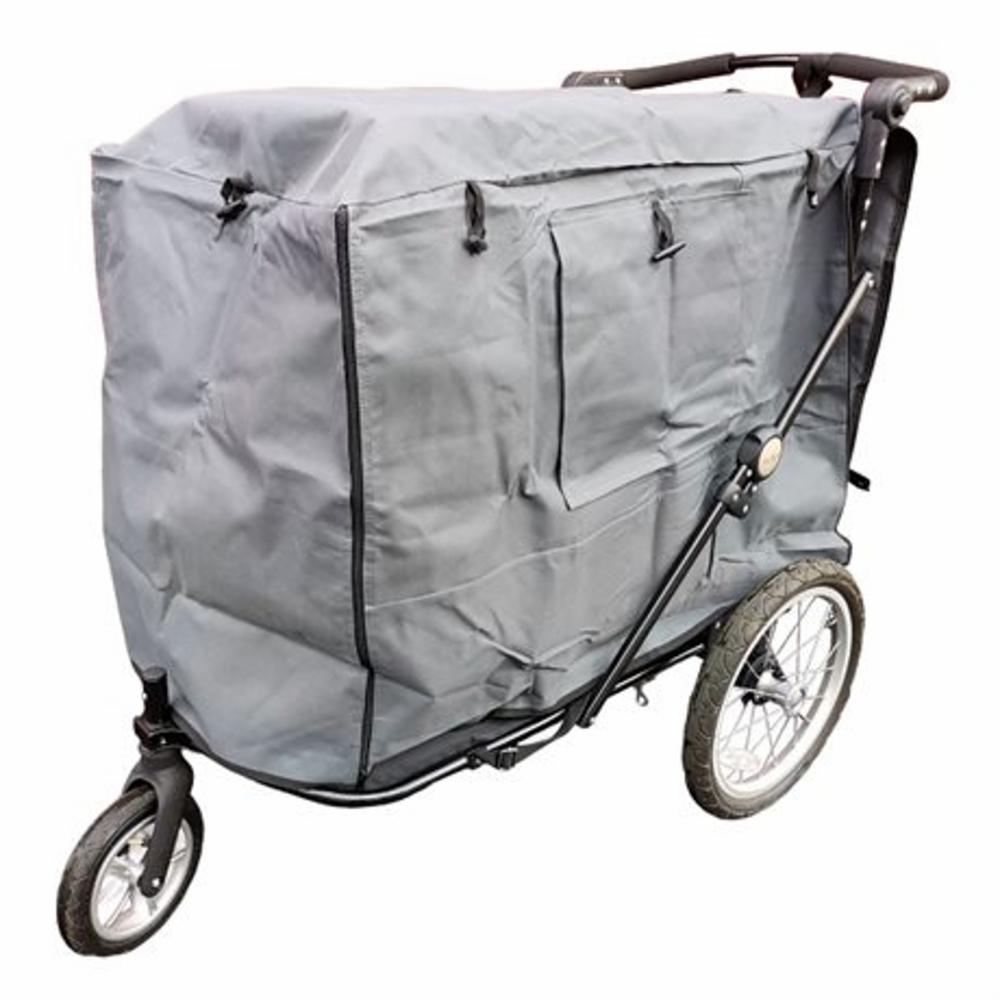 Överdrag/regnskydd till hundvagnarna Safari, Skyline och Silver Wing. Överdraget är tillverkat i slitstarkt canvastyg. På vardera sida finns ventialtionsnät med gardiner som kan rullas upp och fästas i öppet läge. Nerfällda fästs gardinerna fast med karborreband. Överdragets alla sidor är öppningsbara med blixtlås och kan rullas upp och fästas fast.