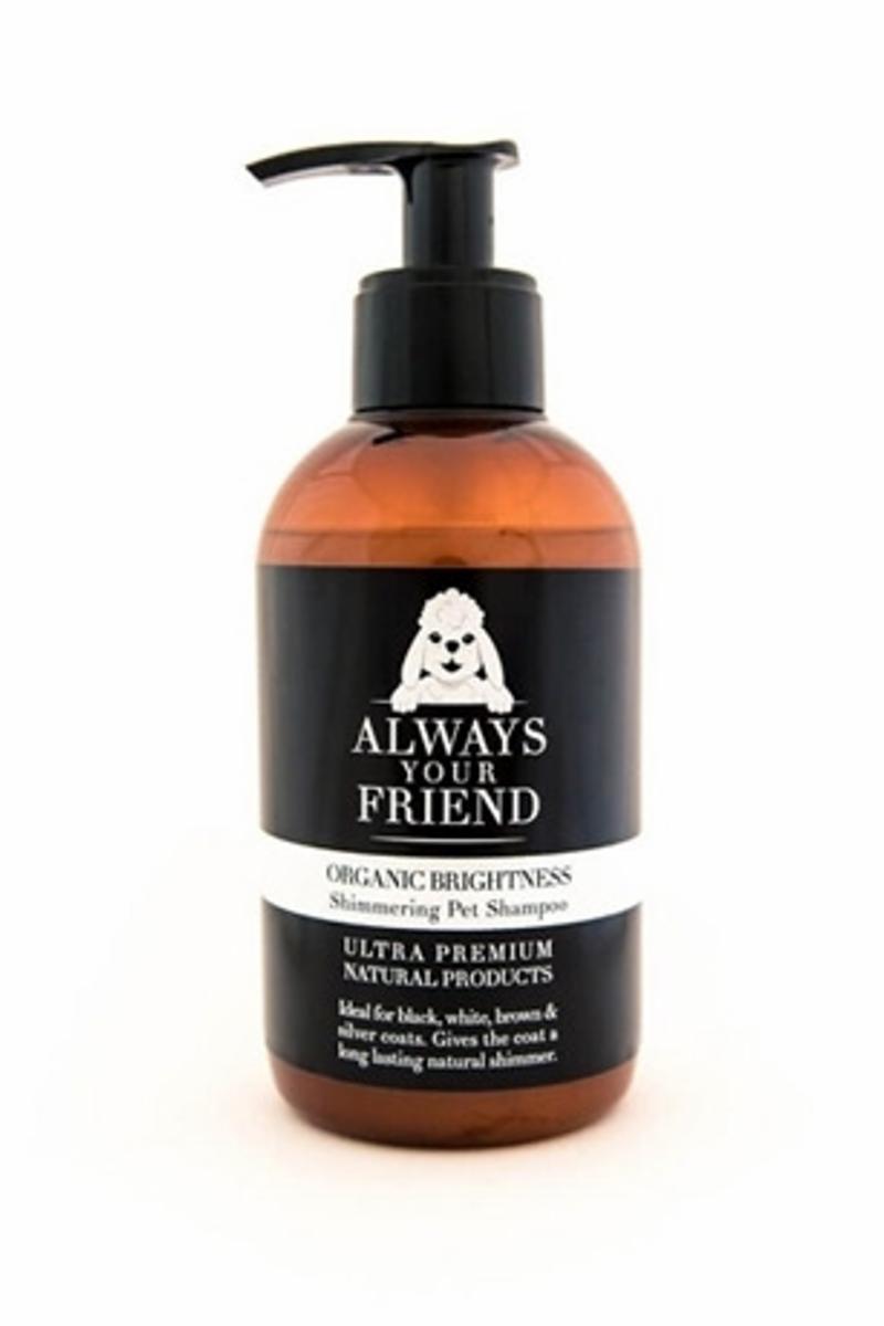 Organic Brightness Schampo är ett ekologiskt hundschampo som framhäver och förstärker pälsens naturliga färger. Detta schampo är idealiskt för hundar med vit, svart och brun päls, men även black & tan-päls och vargsobelpäls. Schampot tillför pälsen spänst, struktur och glans samt skyddar mot smuts och dålig lukt. Innehåller bland annat aloe vera som är mjukgörande och skyddande, samt jättenattljusolja som bevarar hudens och pälsens fuktbalans.
