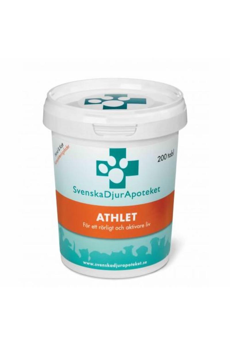 Svenska DjurApotekets Athlet är en specialkombinerad mix med värdefulla näringsämnen som behövs för en god ledhälsa på lång sikt. Athlet främjar ledernas hälsa och normala funktion, fungerar antiinflammatoriskt och är byggstenar för ledbrosket. Athlet ger ett piggare och mer välmående djur. Athlet kan även ges i förebyggande syfte till hårt arbetande hundar. Läs mer om Athlets innehåll längre ner på sidan. Ingredienser: Glukosaminsulfat 2kcl, Metylsulfonylmetan, frystorkat pulver från Grönläppad mussla, L-arginin, Kondroitinsulfat, Kalciumaskorbat (C-vitamin), Mangan. Fyllnadsmedel, Mikrokristallin cellulosa, Dikalciumfosfat, Kokosväxtfett, Kiseldioxid, Magnesiumstearat Deklaration per 1 tablett: a´1,8g Deklaration per 4 dosmått 5,6 g (stor hund) •Glukosamin 400 mg Glukosamin 1,6 g •MSM 400 mg MSM 1.6 g •Grönläppad mussla 250 mg Grönläppad mussla 1 g •L-arginin 200 mg L-arginin 800 mg •Kondroitin 100 mg Kondroitin 400 mg •C-vitamin 50 mg C-vitamin 200 mg •Mangan 11 mg Mangan 44 mg Dosering: En tablett per 10 kilo/dag (maxdosering 4 tabletter/dygn) Glukosamin: Finns naturligt i kroppen; speciellt hög koncentration finns i leder, senor och ledband. Glukosamin stimulerar återbildning av ledvävnad och genom att tillföra glukosamin i kosten ökar produktionen av ledvätska och ledbroskämnen, vilket leder till en bättre mjukhet i leden.Tillskott av Glukosamin har visat sig vara särskilt effektivt när det gäller att säkerställa goda ledfunktioner. Inte bara vid påfrestningar och monotona arbeten utan även i samband med ökad ålder. MSM: MSM har både anti-inflammatoriska och smärtlindrande egenskaper. Många upplever att de får ett starkare och bättre fungerande immunförsvar med MSM. MSM pulver gör cellerna mer genomträngliga vilket medför att cellen lättare kan bli av med gifter och mer effektivt inta näringsämnen, MSM pulver kan användas år efter år utan uppehåll för cellers optimala funktion. MSM finns i varje cell i kroppen med högsta koncentration i leder, muskler, päls, hud, naglar, bindväv. Kroppen använder MSM för att skapa nya celler, ett arbete som pågår dygnet runt. Om inte svavel finns, blir uppbyggnaden därefter. Vid läkning av skador, resulterar svavelbrist ofta i kraftig ärrbildning. Överflödigt svavel utsöndras ur kroppen inom ett dygn och det finns inga biverkningar och MSM räknas som ett av naturens mest ogiftiga ämnen. Grönläppad mussla: Denna unika mussla innehåller näringsämnen från havet som organismen behöver för att bygga upp hud, brosk, bindväv och ledvätska. Musslan utmärker sig genom en ovanligt hög halt av aminosocker - glukosaminoglykaner (GAG) som har en positiv effekt vid behandling av ledsjukdomar. Dessa glukosaminoglykaner är vattenlösliga och tas upp direkt från tarmen, och förs via blodet direkt ut i ledvätska och brosk. Kondroitin, en av de naturliga komponenterna i det grönläppade musselextraktet, bidrar till att förebygga nedbrytning av ledbrosk. Dessutom innehåller extraktet bland annat den unika, omättade fettsyran ETA, samt andra omättade omega-3 och –6 fettsyror med inflammationsreducerande egenskaper L-Arginin: L-arginin är en mycket viktig aminosyra och en av de åtta essentiella. L-Arginin ökar blodcirkulationen vilket ger bättre ”smörjning” av leder och ligament. vid skador och inflammationer så är en ökad blodcirkulation i det skadade och inflammerade området avgörande för läkningsprocessen. Kondroitin: Långa kondroitinkedjor utgör grunden till all broskvävnad, och bidrar till att göra brosket elastiskt så att det kan ta upp belastningar och verka stötdämpande. Brosket har inte någon egen blodgenomströmning som kan ge den näring för uppbyggnad och underhåll. De näringsämnen som brosket behöver för uppbyggnad och underhåll får den i stället från den ledvätska som flödar runt leden när leden arbetar. Kondroitin fungerar som en magnet för denna vätska, och gör den lättare åtkomlig för brosket. Kondroitin hindrar även befintligt brosk från att brytas ner och liksom glukosamin hjälper det även till vid nybildning av broskvävnad. Genom att öka halterna av kondroitin i kosten så ökar nybildningen av brosk. C-vitamin: (Kalciumaskorbat) Vårat C-vitamin är kalciumaskorbat, som är skonsamt för magen. C-vitamin har en mängd funktioner bl.a. för immunsystemets normala funktion och såsom antioxidantia skydda mot de skadliga fria radikalerna som hela tiden bildas vid ämnesomsättningen. C-vitamin främjar också kollagenbildningen för broskets och benstommens normala funktion.