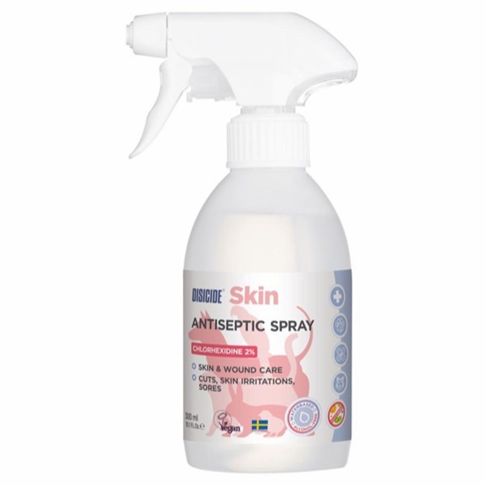 Disicide Skin Antiseptic är en antiseptisk sårspray med 2% klorhexidin. Sprayen är skonsam mot din hunds hud och effektiv i behandlingen av till exempel småsår, skärsår, skavsår, bitskador, svamp och hot spots. Dödar 99,9% av bakterier, virus och svamp och förebygger uppkomsten av infektioner.