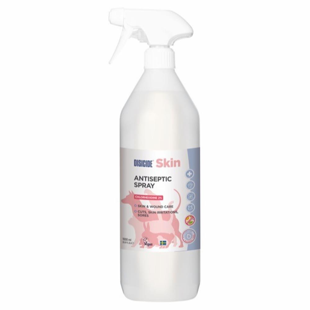 Disicide Skin Antiseptic är en antiseptisk sårspray med 2% klorhexidin. Sprayen är skonsam mot din hunds hud och effektiv i behandlingen av till exempel småsår, skärsår, skavsår, bitskador, svamp och hot spots. Dödar 99,9% av bakterier, virus och svamp och förebygger uppkomsten av infektioner.