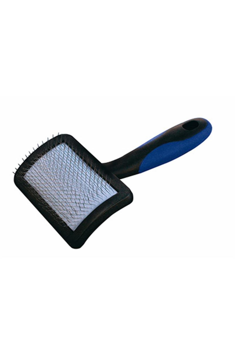 Kardans böjda rygg gör det lättare att nå svåra och känsliga områden. Låg vikt för att minska handtrötthet. Dessa borstar är formad av slagtålig ABS plast med halkfritt handtag. Den smidiga dynan tillåter stiften att böja med håret, vilket minimerar päls skador. Den är en karda som fungerar bra att använda vid torkning pälsen på grund av den extra fina avståndet mellan stiften av rostfritt stål. BRUKSANVISNING : LÅNG PÄLS: Borsta med lätta, långa drag, borsta förbi slutet på hårstråna för att undvika statisk päls och brutna hårstrå. För bästa resultat borsta håret i olika lager. Börja vid botten med att dela pälsen horisontellt, håll upp den oborstade pälsen med din fria hand. Arbeta dig successivt uppåt. Ha din handled rak för att undvika kontakt med din hunds hud. LOCKIG PÄLS: Borsta i pälsens riktning och sen mot riktningen med lätta långa tag. STRÄV PÄLS: Borsta i pälsens riktning och sen mot riktningen om det är nödvändigt, för att ta bort tovor och död päls. Om pälsen är tovig, använd borsten tillsammans med Show Tech Mat Buster. För att undvika tovor bör hunden badas regelbundet, behandlas med balsam och borstas dagligen. Storlek 8*5 cm