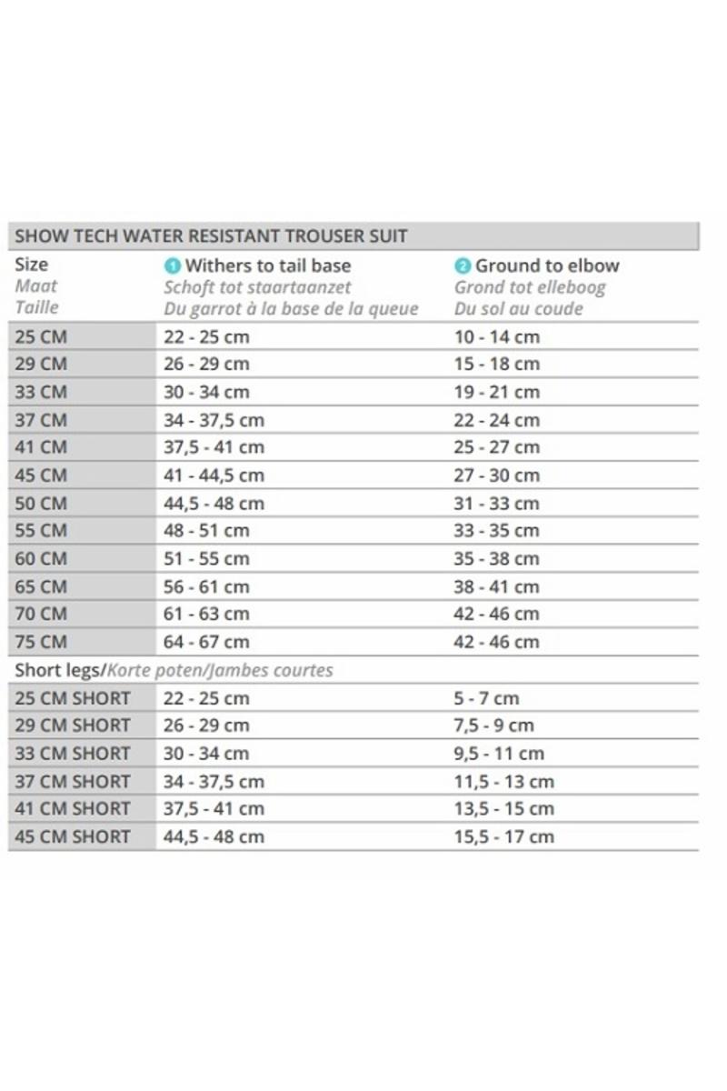 Show Tech Vattentäta overaller finns i alla storlekar från 25 cm till 75 cm med tillägg av speciella kortbenade modeller i storlekarna 25, 29, 33, 37, 41 och 45 cm. Dessa vattentäta overaller kan justeras på bröstet, midjan, nacken, benen och runt svansen för att garantera en bekväm passform för alla raser samtidigt som hunden får maximal rörelsefrihet. Denna design har också en högre krage för att hålla din hund torr. Size table 25 cm Toy Poodle 29 cm Pomeranian 33 cm Maltese 37 cm Mini Dachshund 41 cm Lhasa Apso 45 cm Cocker Spaniel 50 cm Border Collie 55 cm Airdale Terrier, Standard Poodle Bitch 60 cm Bearded Collie, Standard Poodle Male 65 cm Afghan, German Shepherd 70 cm Giant Schnauzer 75 cm Russian Terrier 25 cm short leg Yorkshire Terrier 29 cm short leg Mini Schnauzer 33 cm short leg Jack Russel 37 cm short leg Bichon 45 cm short leg Welsh Corgi