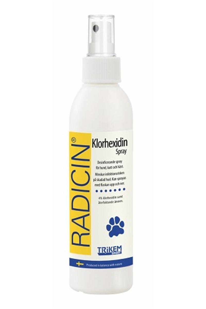 KlorhexidinSpray är ett antiseptiskt spray för desinfektion och rengöring av skadad hud. Lämplig vid mindre hudskador eller utslag, i päls och på tassar. Rengör den skadade huden från lös smuts innan användning, t ex. med TRIKEM ? Koksalt. Innehåller återfuktande ämnen för upprepade behandlingar.