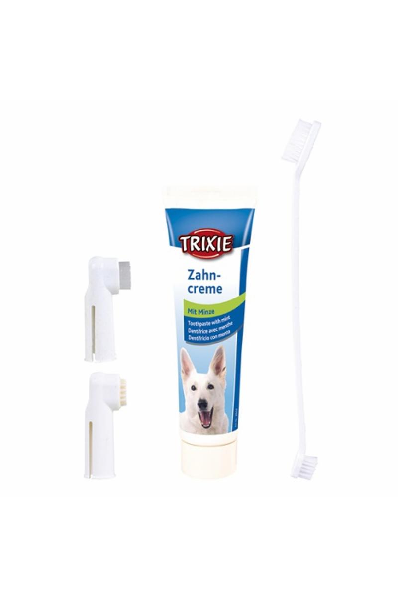 Tandvårdsset till hund. Innehåller tandkräm med mintsmak, för fräsch andedräkt. En tandborste, med två olika tjocklekar. Två fingerborstar, en för massage av tandköttet och en tandborste.
