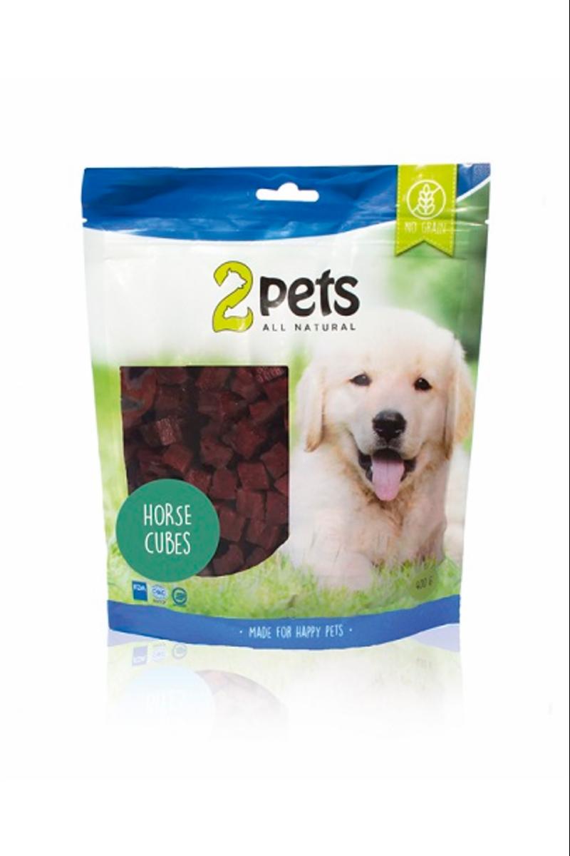 Ett naturligt och smakrikt hundgodis med hög kötthalt. Tillverkade av färska råvaror med låg fetthalt. Ett kompletteringsfoder för hundar och ska ges som belöning vid sidan av en balanserad kost. Se alltid till att hunden har fri tillgång till färskt vatten. Allt godis/tugg från 2pets är ett godkänt och säkrat livsmedel inom EU (HACCP) och USA (FDA). Fabriken är även ISO 22000 certifierade, vilket innebär att spårbarheten säkras i hela produktionskedjan. Storleken på godbitarna: 1x1x1 cm Sammansättning: häst 89,8%, glycerin 3%, majsstärkelse 3%, sorbitol 2%, vegetabiliskt protein 2%, salt 0,2% Analytiska beståndsdelar: råprotein 28%, vatten 23%, råfett 5%, råaska 4,5%, fibrer 0,2%