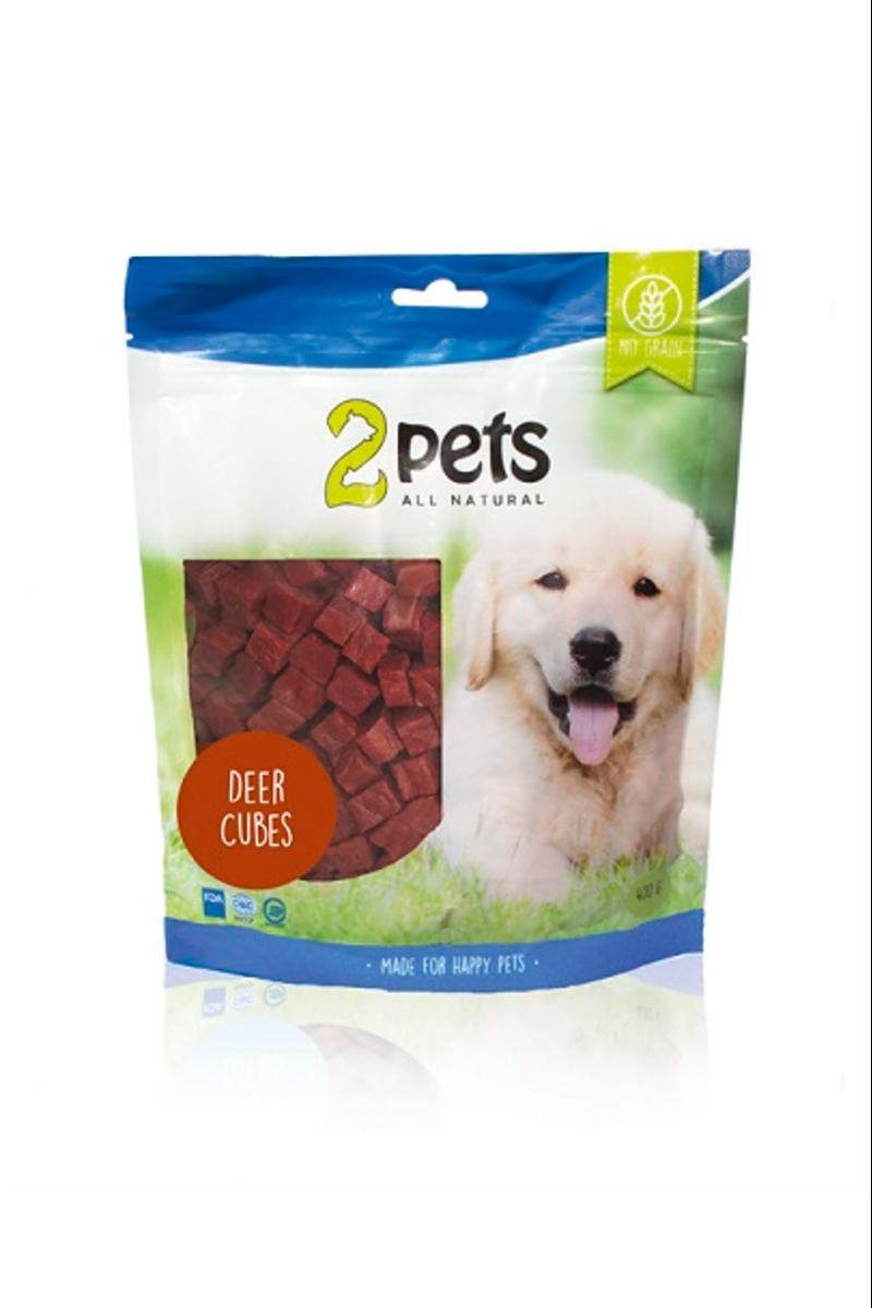 Ett naturligt och smakrikt hundgodis med hög kötthalt. Tillverkade av färska råvaror med låg fetthalt. Ett kompletteringsfoder för hundar och ska ges som belöning vid sidan av en balanserad kost. Se alltid till att hunden har fri tillgång till färskt vatten. Allt godis/tugg från 2pets är ett godkänt och säkrat livsmedel inom EU (HACCP) och USA (FDA). Fabriken är även ISO 22000 certifierade, vilket innebär att spårbarheten säkras i hela produktionskedjan. Storleken på godbitarna: 1x1x1 cm Sammansättning: hjort 89,8%, glycerin 3%, majsstärkelse 3%, sorbitol 2%, vegetabiliskt protein 2%, salt 0,2% Analytiska beståndsdelar: råprotein 28%, vatten 23%, råfett 5%, råaska 4,5%, fibrer 0,2%