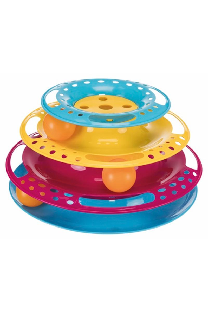 Rolig kattleksak i plast med bollar på olika nivåer. Bollarna kan tas bort.