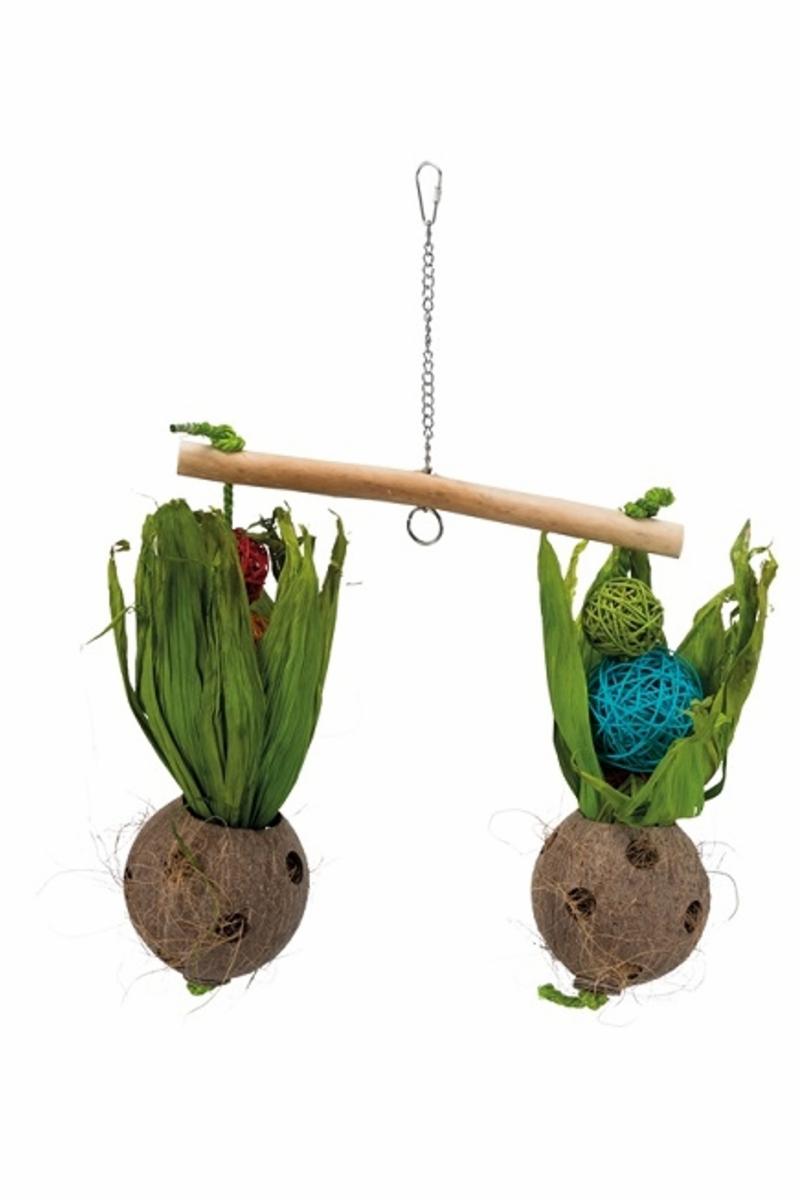 Gungbräda med kokos, pil, majsblad och trä som både är ätbart och passar som naturligt bomaterial (kokosfibrerna är smältbara). Gungbrädans naturliga form är anpassad för fågelns fötter och gör att den sitter bra.